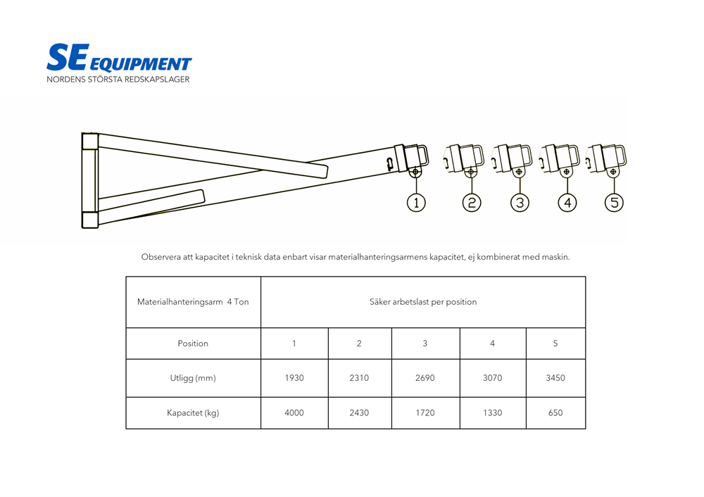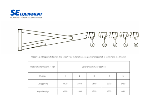 Observera: Kapaciteten som anges i den tekniska specifikationen avser materialhanteringsarmens kapacitet, inte den kombinerade kapaciteten med teleskoplastaren.